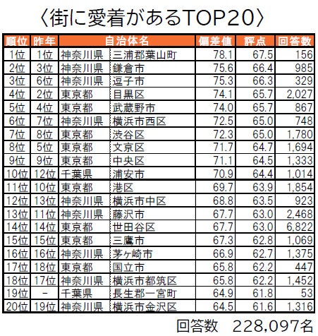 1位は3年連続で神奈川県三浦郡葉山町で、「街の幸福度」でも1位となっており、唯一偏差値80台の極めて高い評価を得ています。2位は2年連続で神奈川県鎌倉市で、「街に誇りがある」「街に愛着がある」の両ランキングでも2位となっています。3位は神奈川県逗子市で、「街に愛着がある」でも3位です。