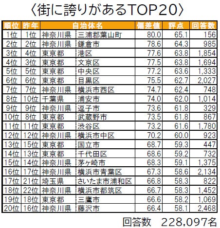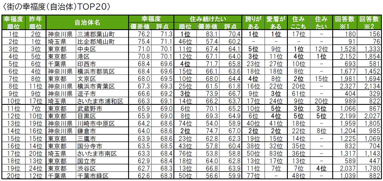 街の幸福度(自治体)ランキング<TOP20>&住み続けたい街/街に誇りがある/街に愛着がある<各TOP20>