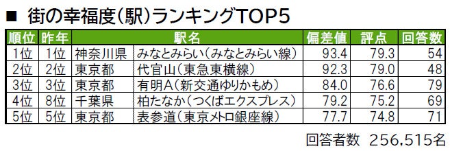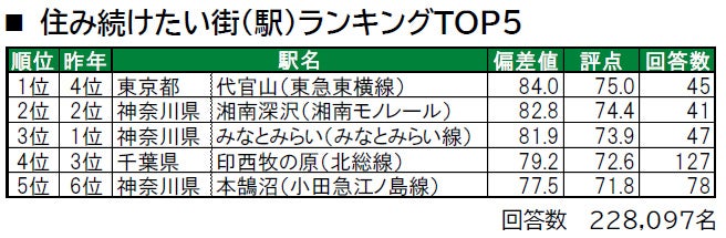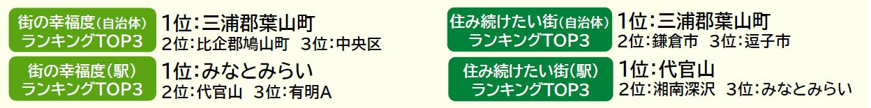 1位は東京都渋谷区に位置する代官山で、「街の幸福度」では2位の駅です。2位は2年連続で、神奈川県鎌倉市に位置する湘南深沢です。3位は、「街の幸福度」で1位のみなとみらいです。