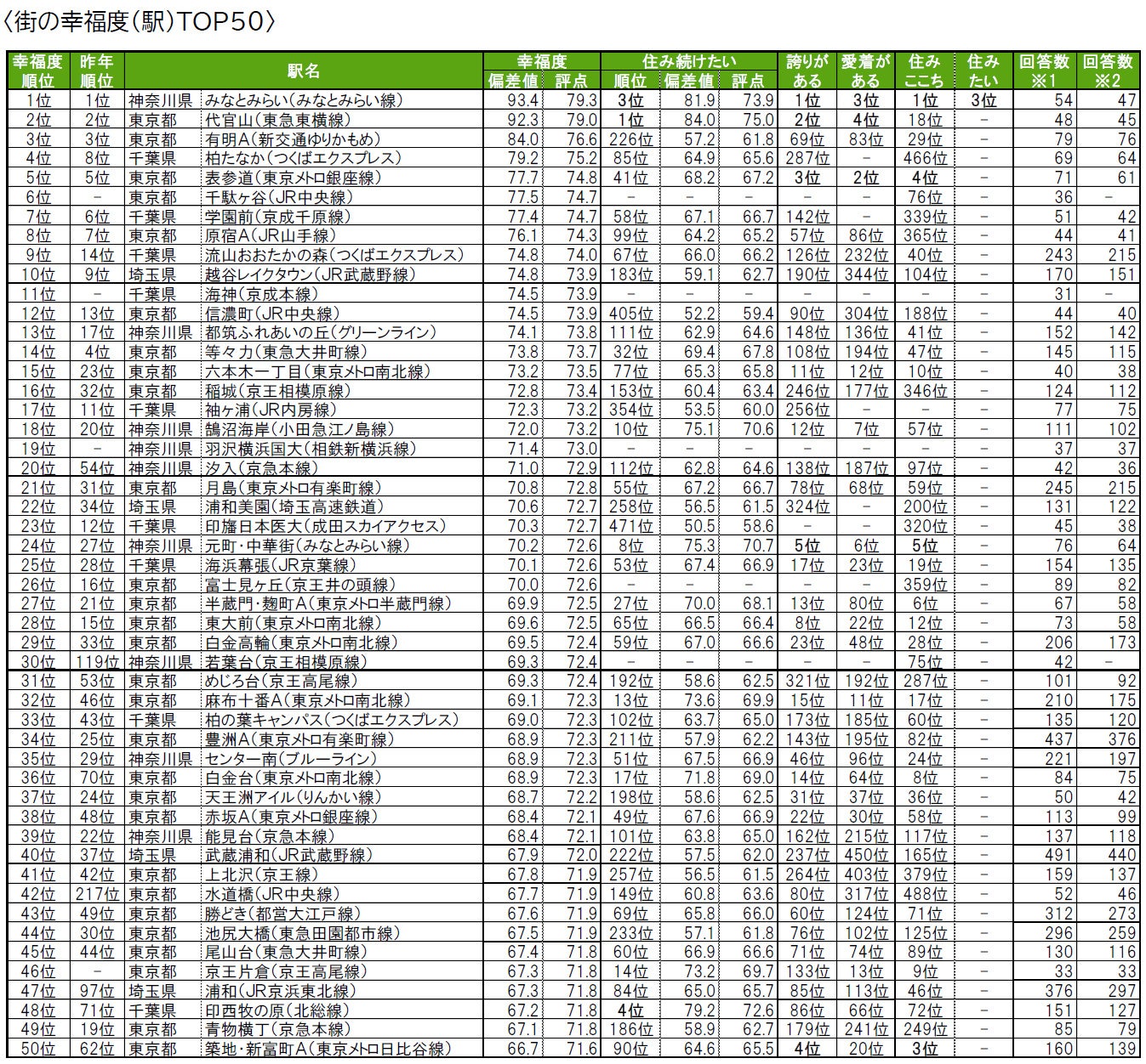 街の幸福度(駅)ランキング<TOP50>