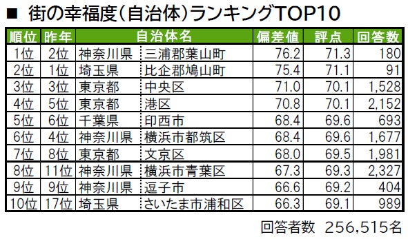 ●「街の幸福度」のトップ2の自治体は、いずれも郡部に属する町(神奈川県三浦郡葉山町・埼玉県比企郡鳩山町)となっています。トップ10内では、8位の神奈川県横浜市青葉区(昨年11位)、10位の埼玉県さいたま市浦和区(昨年17位)が昨年から順位を上げています。