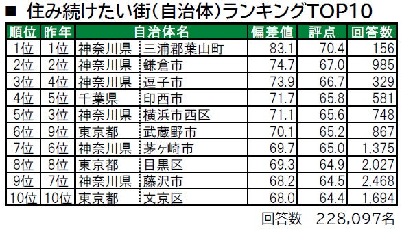 ■住み続けたい街(自治体)トップは、3年連続で神奈川県三浦郡葉山町