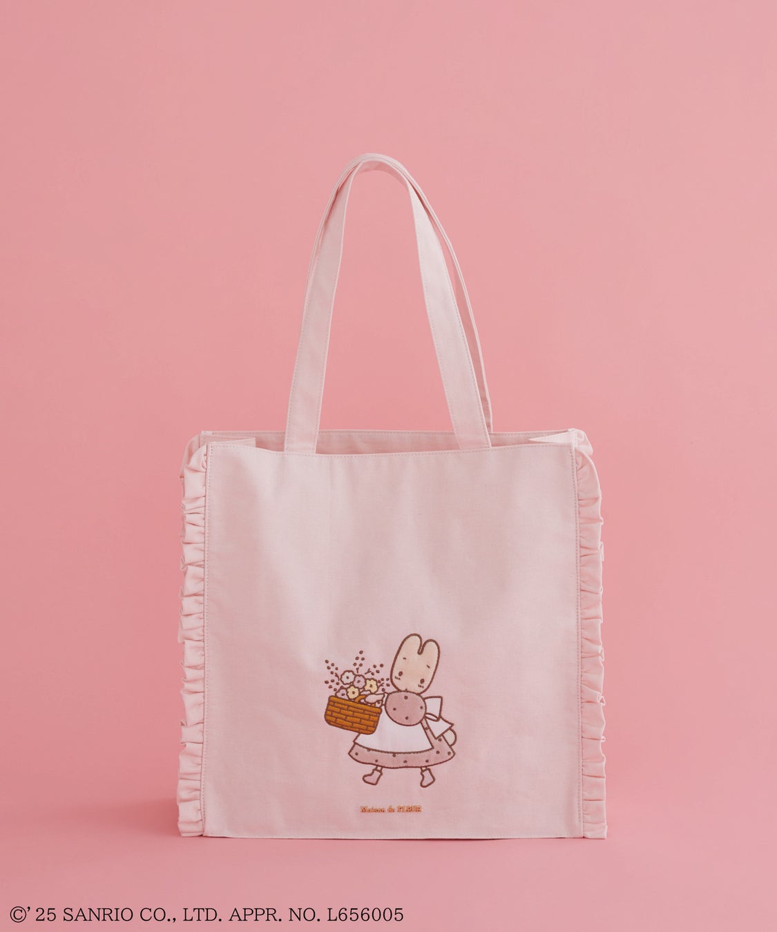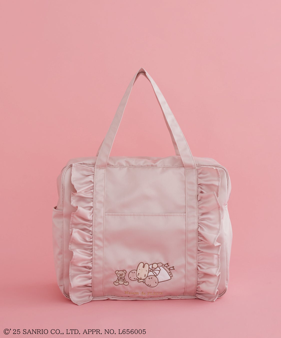 Maison de FLEURらしいフリルが付いたバッグは、2型のラインアップ。淡いピンクのスクエアトートバッグは、お花を持ったマロンクリームをフロントに刺繍。裏地にはマロンクリームの総柄を使用し、世界観を詰め込んだアイテムに仕上げました。くすみピンクのキャリーオンバッグには、マロンクリームがくまのぬいぐるみに話しかけているかのような可愛らしい姿のワッペンデザインを施しました。