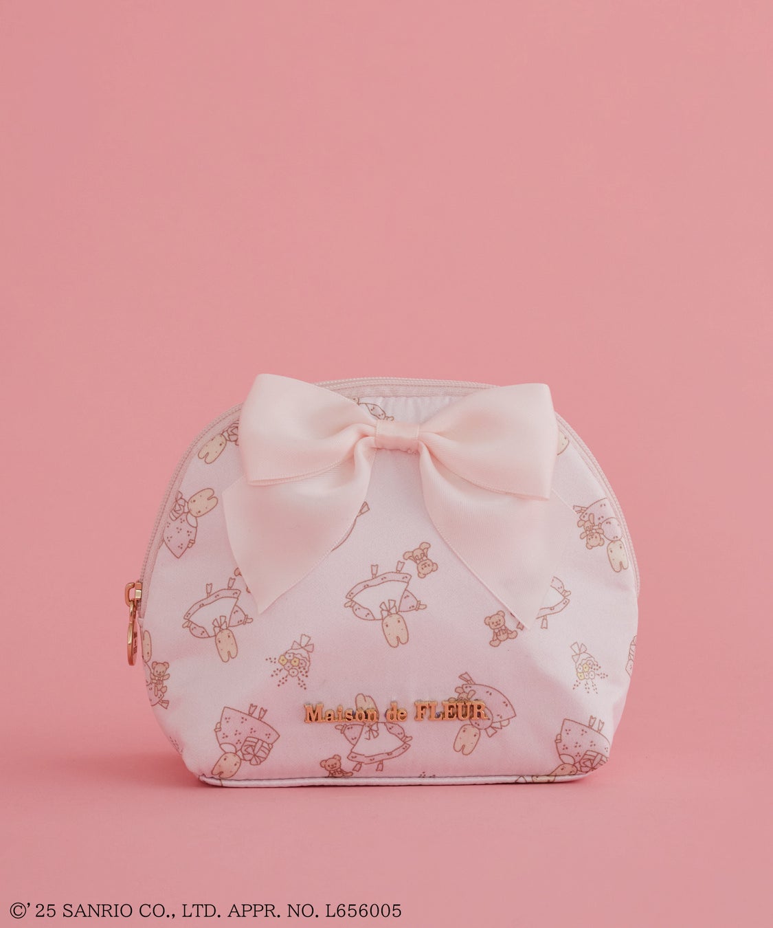 お花やギフトボックスを散りばめた総柄のラウンドポーチは、ブランドならではの大きなリボンをあしらい、華やかさをプラス。そのほか、花柄のワンピースと白いエプロンを着たぬいぐるみチャームもご用意しております。