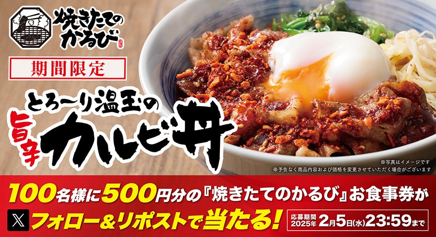 株式会社物語コーポレーション(本社:愛知県豊橋市/代表取締役社長:加藤 央之)が全国27店舗を展開する、「焼きたてのカルビ丼」と「ユッケジャンスープ」の専門店『焼きたてのかるび』は、2025年1月30日(木)より公式X(旧Twitter)で「とろ~り温玉の旨辛カルビ丼」販売記念フォロー&リポストキャンペーンを実施いたします。