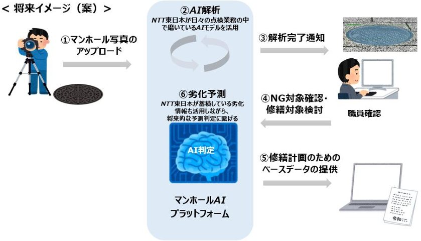 一方、NTT東日本ではインフラ通信事業者として、通信ビル・電柱・とう道・ケーブル等の多くの通信設備を維持・管理しています。その維持・管理業務において、デジタル技術を活用して作業・業務の効率化を図っており、横浜市におけるマンホール点検業務のDX推進に貢献できると考え、「YOKOHAMA Hack!」に応募し、この度、実証実験プログラムを開始するに至りました。