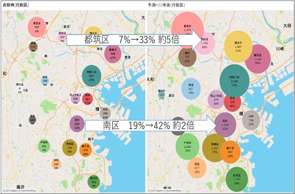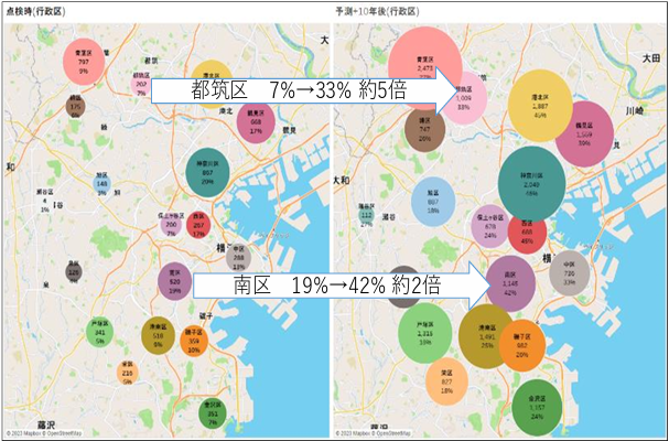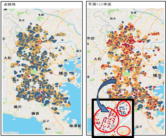 横浜市からは、「下水道マンホール蓋は材質や設置年代を判別するための『型式判定』と、劣化状態を判断する錆・摩耗に関する『異常判定』は、現在の調査業務で適用できる精度の判定を実現することができ、作業時間を短縮することが期待できる結果となりました。『劣化予測』では、錆に関する劣化予測モデルを構築し、将来の錆の劣化進行を下水道マンホール蓋1か所毎に算出することで、下水道マンホール蓋の更新計画策定の資料として活用できる可能性が得られました。」と総評コメントも出されています。