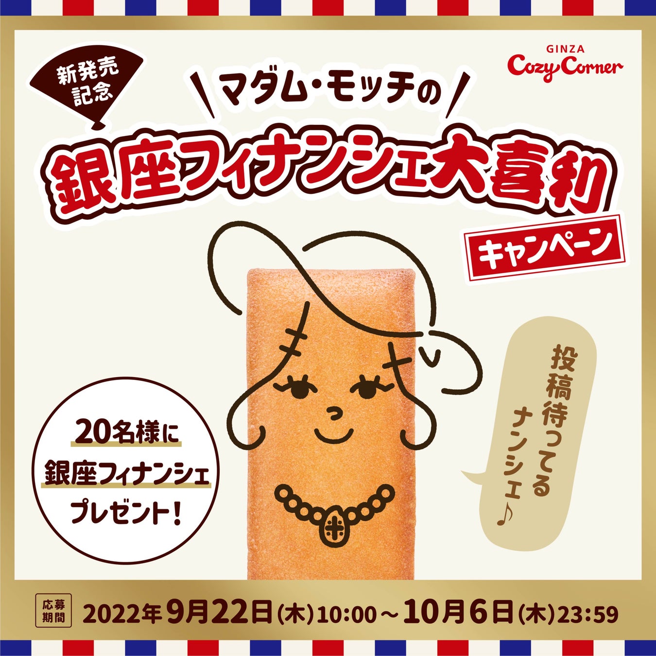 株式会社銀座コージーコーナー<代表取締役社長 船田知秀 東京都中央区>は、2022年9月23日(金・祝)から全国の店舗(※)で「銀座フィナンシェ」を販売。発売を記念して店頭及びTwitterでキャンペーンを実施します。