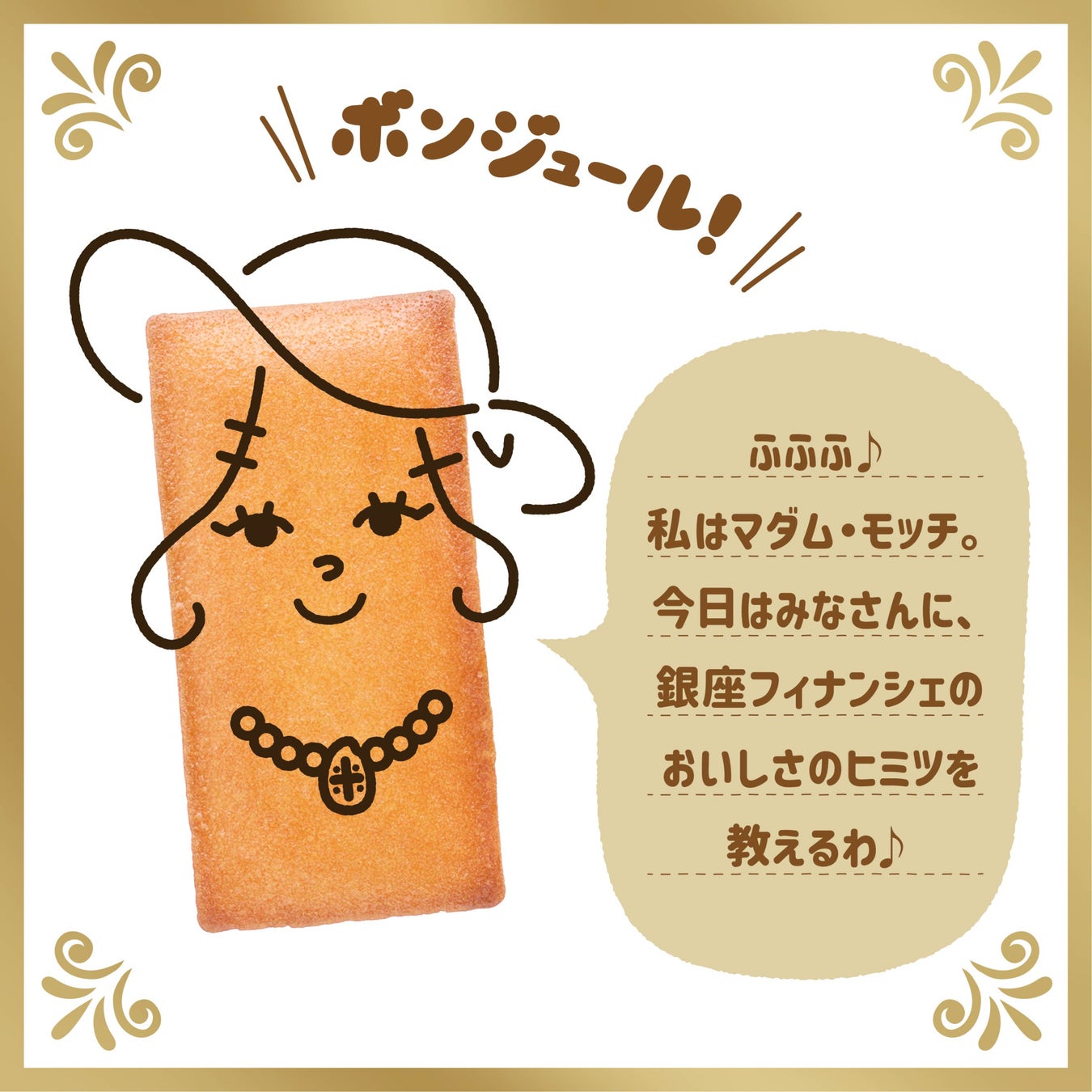 年齢はヒミツ。フランス生まれ銀座育ち、もっちりヘアーがチャームポイントのオリジナルキャラクター「マダム・モッチ」。マダム・モッチが初めて「銀座フィナンシェ」を食べた時に言った台詞を予想して引用ツイートで参加!
