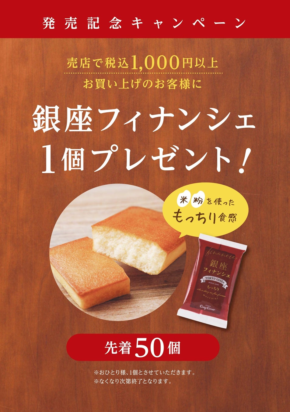 各店先着50名様に、税込1,000円以上お買い上げで「銀座フィナンシェ」を1個プレゼント。