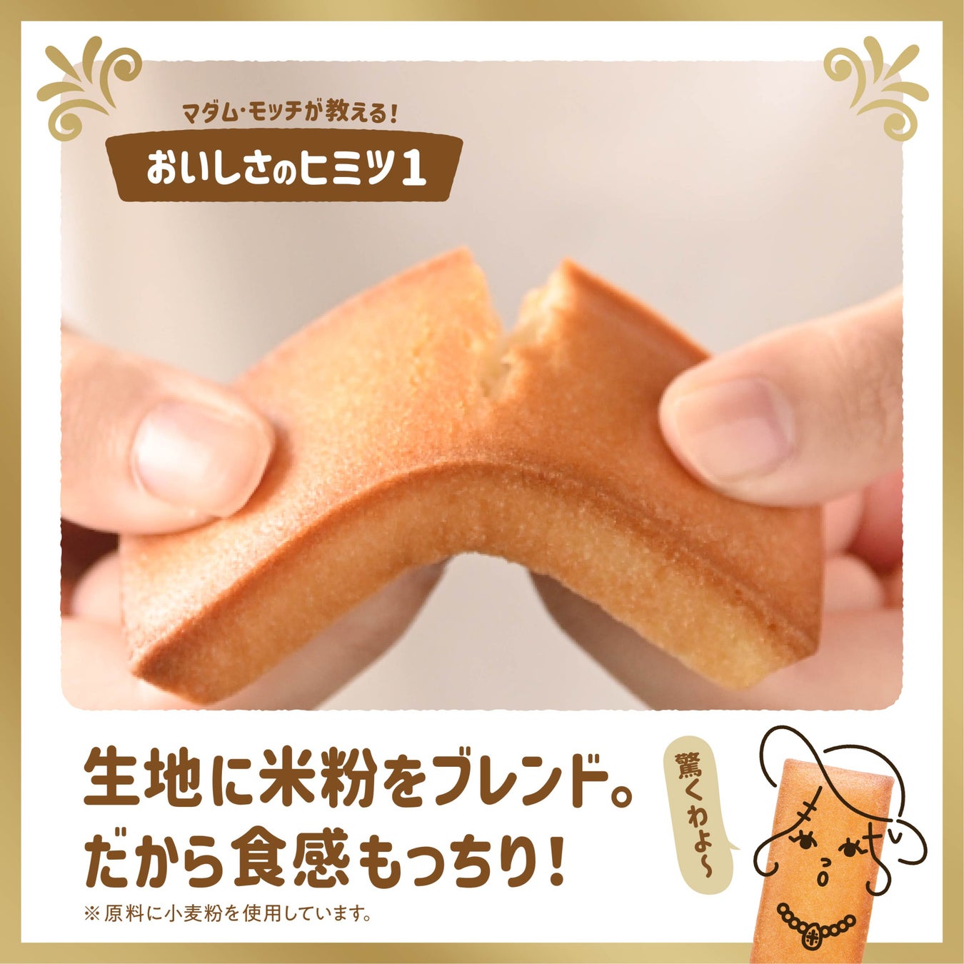 米粉を使用した、もっちり、しっとり、新食感のフィナンシェです。もっちりとしたやさしい食感から米粉の素朴な味わいと、アーモンドの香ばしさ、バターの芳醇が広がります。