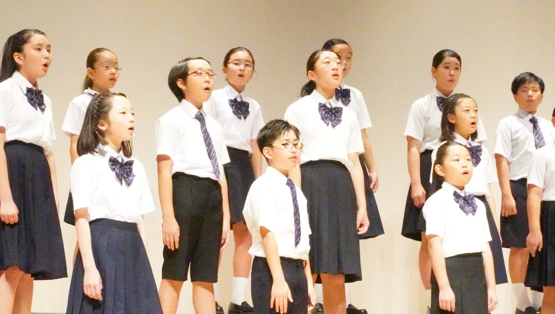 1曲目は元気よく「気球に乗ってどこまでも」を歌い始めました。2曲目の「あおい天使」は、NHK全国学校音楽コンクール小学生の部の課題曲です。戦前から続くコンクールには「被爆した人が参加したことがあるかもしれない」と思いを馳せ、心の翼を広げ優しく強く成長していく天使の気持ちを歌いました。