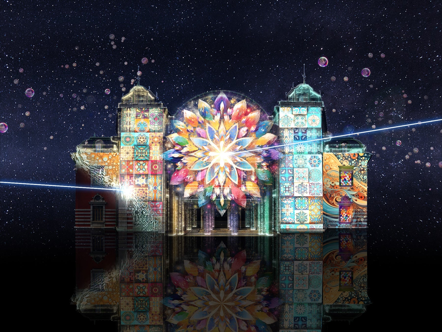 まるで大阪の街の過去・現在・未来を旅するようなストーリーを、幻想的な光の芸術で表現します。カラフルな光に包まれる中央公会堂と、同時に放たれるシャボン玉がきらめく、幻想的な夜をお楽しみください。