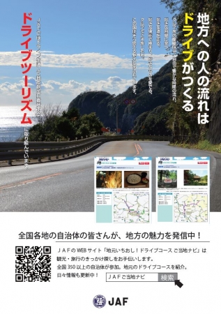 JAFでは会員向け優待サービスを道の駅でも展開しており、優待が受けられる道の駅は全国490にのぼります(2016年1月末現在)。また、「ドライブが日本を元気にする」を合言葉に、ドライブによる地方創生(地域振興)に取組んでおり、魅力ある地域の情報を総合観光情報サイト「JAFナビ」や機関誌「JAFMate」、情報誌「JAFPLUS」などで発信しています。道の駅の情報も含んだドライブコースの紹介などにより、交流人口を拡大させ、地域の活性化につなげる活動を推進しています。ブースでは、関連情報のパネルを展示し、来場者にPRを行います。
