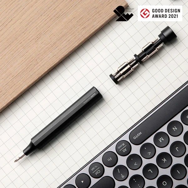 12本すべてのダブルヘッドビットをこの1本に収納できる、ポータブル性に優れたコンパクトな手動式の精密ドライバーペンです。