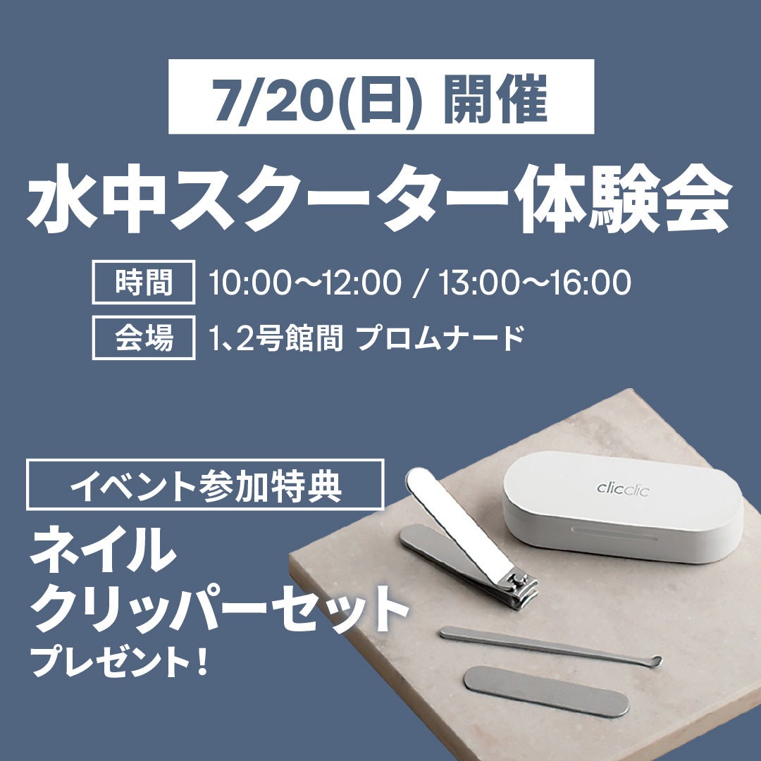 HOTOからはアウトドアやキャンプで活躍するキャンピングライトや、電動空気入れの エアポンプ Master などのアイテムを展示・販売。ダイビングなどの海遊びにぴったりな水中スクーター Waydoo Subnado(サブナード)も販売いたします。さらに7月20日(日)には1号館と2号館の間のプロムナードにて、水中スクーターの実演会を開催します。特設の水槽で実際に性能を体感いただけます。購入特典や体験会限定の参加特典もご用意しておりますので、ぜひこの機会にお立ち寄りください!