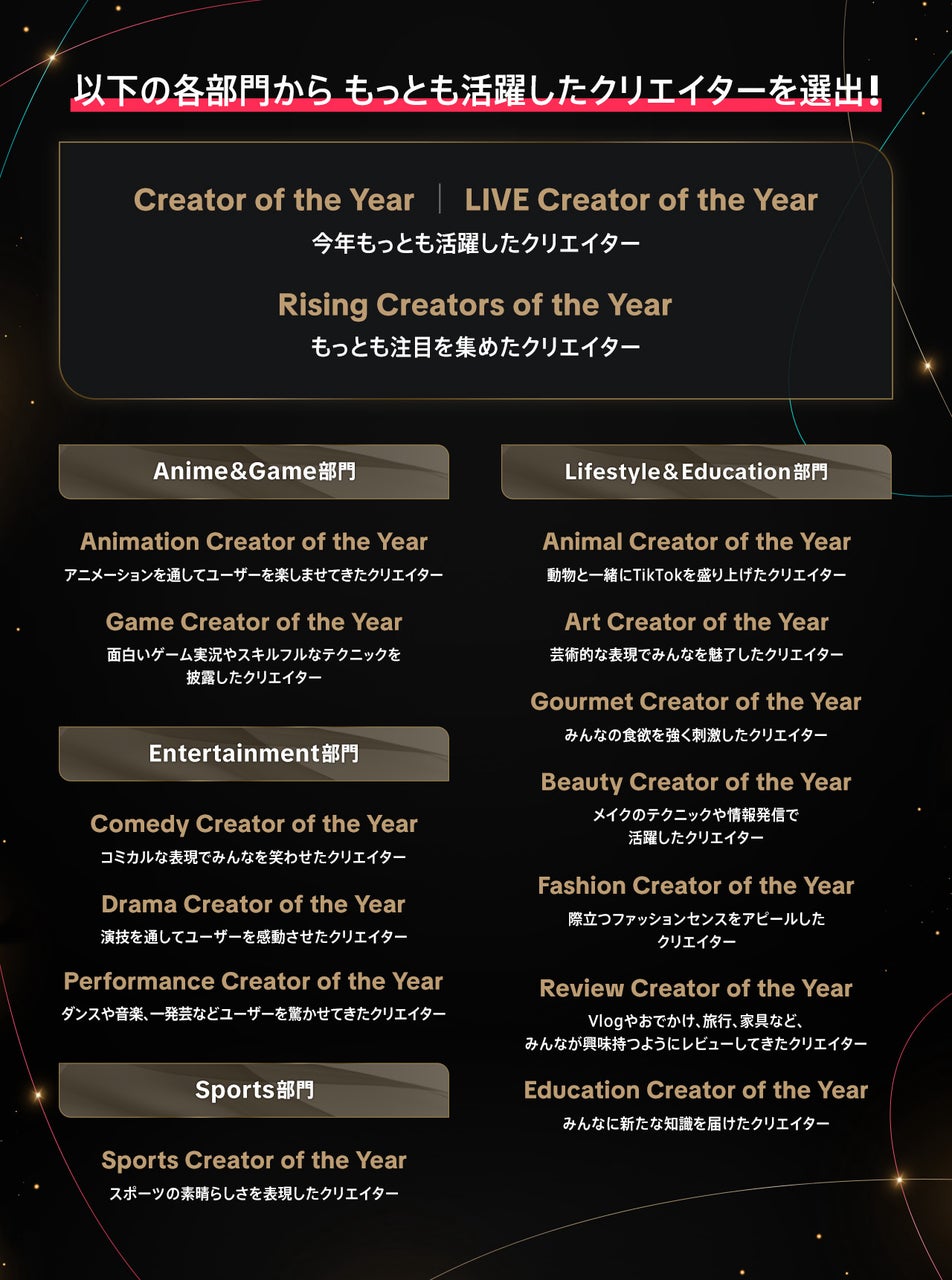 今年最も活躍したクリエイターを「Creator of the Year」「LIVE Creator of the Year」として、最も注目を集めたクリエイターを「Rising Creator of the Year」として表彰します。加えて、特定の分野において活躍したクリエイターを、それぞれの部門における「oo Creator of the Year」として表彰します。