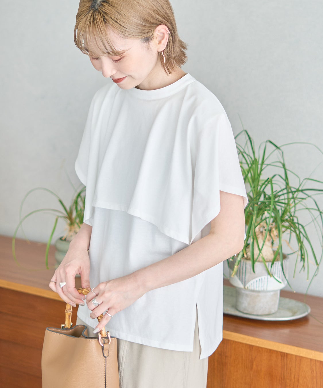 ケープの丈は、気になる二の腕をカバーしつつ、ウエストをインした際にバランスよく見えるようにこだわりました。
