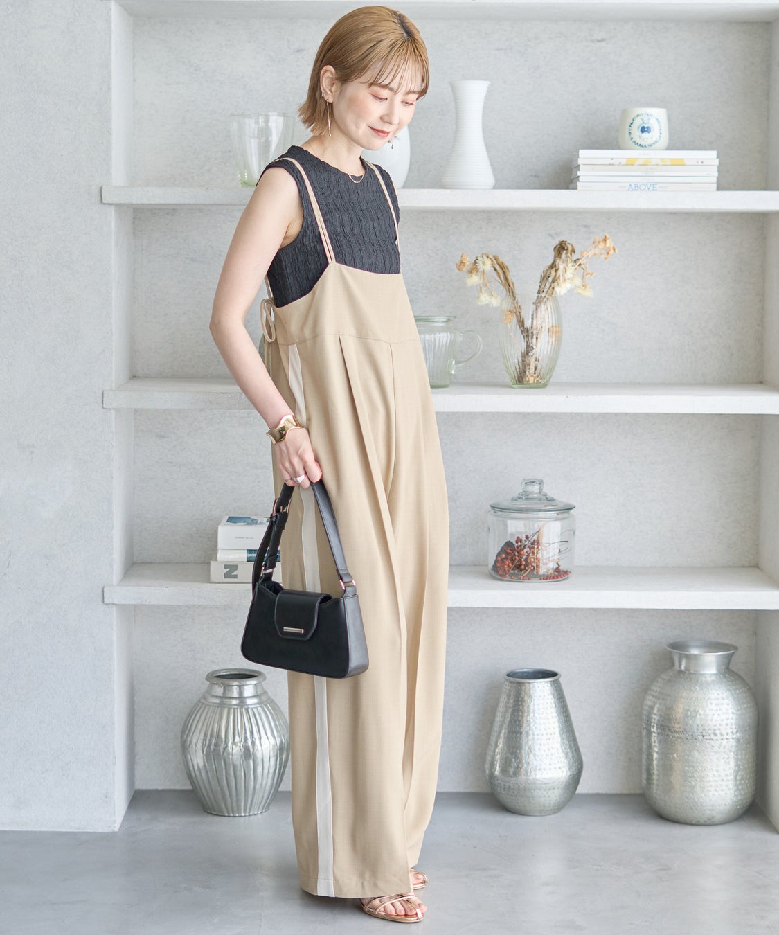 サイドラインと2本の肩紐がポイントのサロペットは、上半身はすっきりと見えつつ、下半身はゆったりとさせ体型カバーがかなうデザインを採用。柔らかなベージュとシックなチャコールグレーの2色をご用意し、合わせるアイテム次第でさまざまなコーディネートを楽しんでいただける1着です。