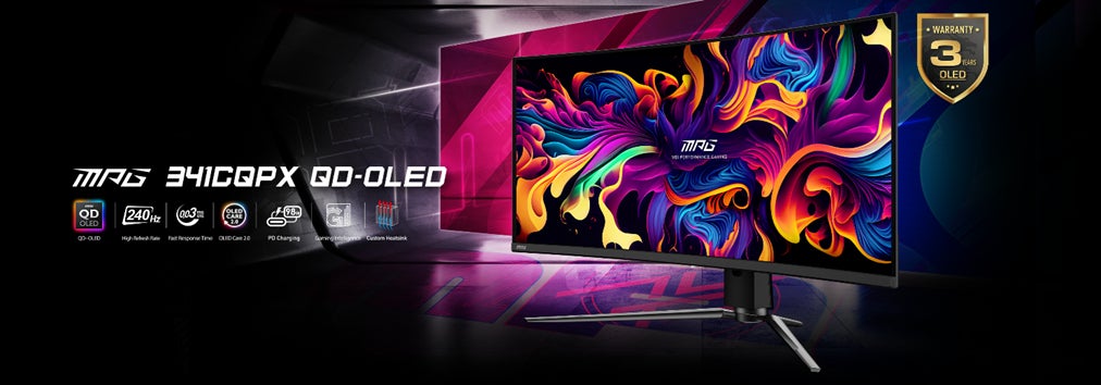 ゲーミングモニター「MPG 341CQPX QD-OLED」は、34インチのウルトラワイド、UWQHD解像度(3440×1440)、リフレッシュレート240Hz、究極の没入感と鮮明さを実現する湾曲率1800Rが大きな特徴です。最先端のQD-OLEDパネルを搭載し、0.03msの応答速度で正確かつ鮮やかな映像を実現します。トップレベルのゲーム用に設計されたこのゲーミングモニターには、KVM、HDMITM 2.1接続、VESA ClearMRTM 13000を含むMSI独自のGaming Intelligenceソフトウェアが搭載されており、最高級の技術と最高のパフォーマンスを提供します。