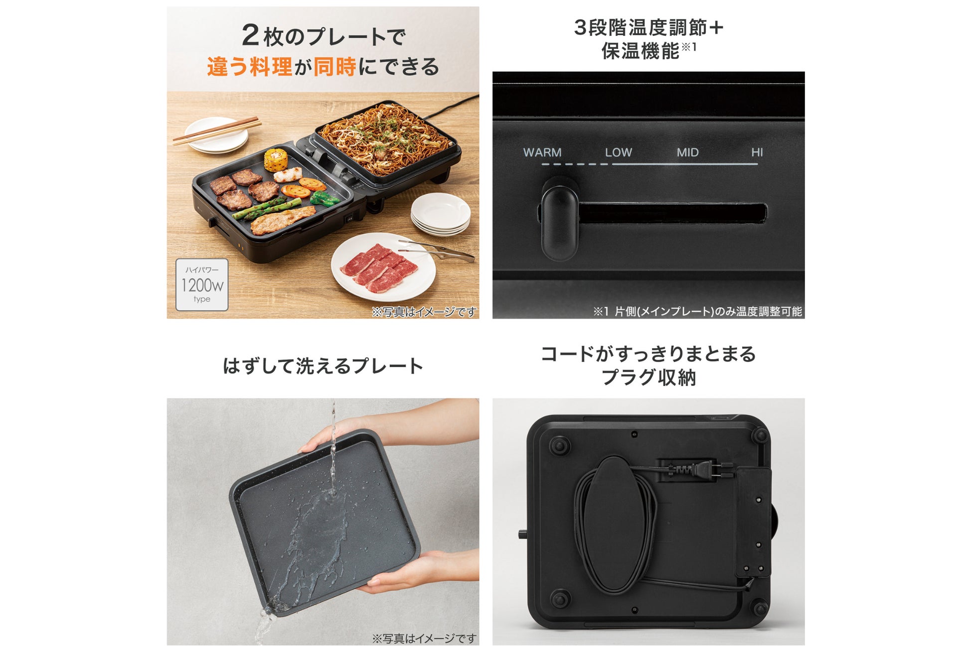 折りたたみホットプレートは、それぞれ独立した2枚のプレートを搭載。広げれば焼きプレートが大きく使え、異なる料理を同時に調理したり、複数人で焼肉を楽しんだりすることが出来ます。
