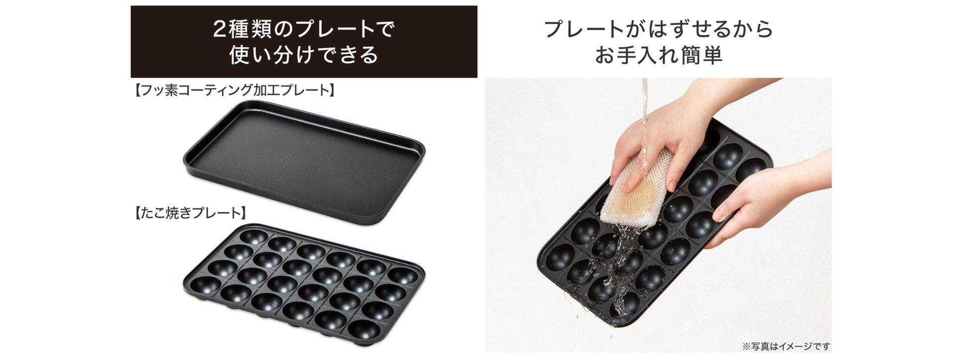 ミニフラット&たこ焼き器は、本体のサイズ幅が約31cm、奥行きが約21cmとコンパクトで、フラットなプレートとたこ焼きプレートの2種類をお使いいただけます。