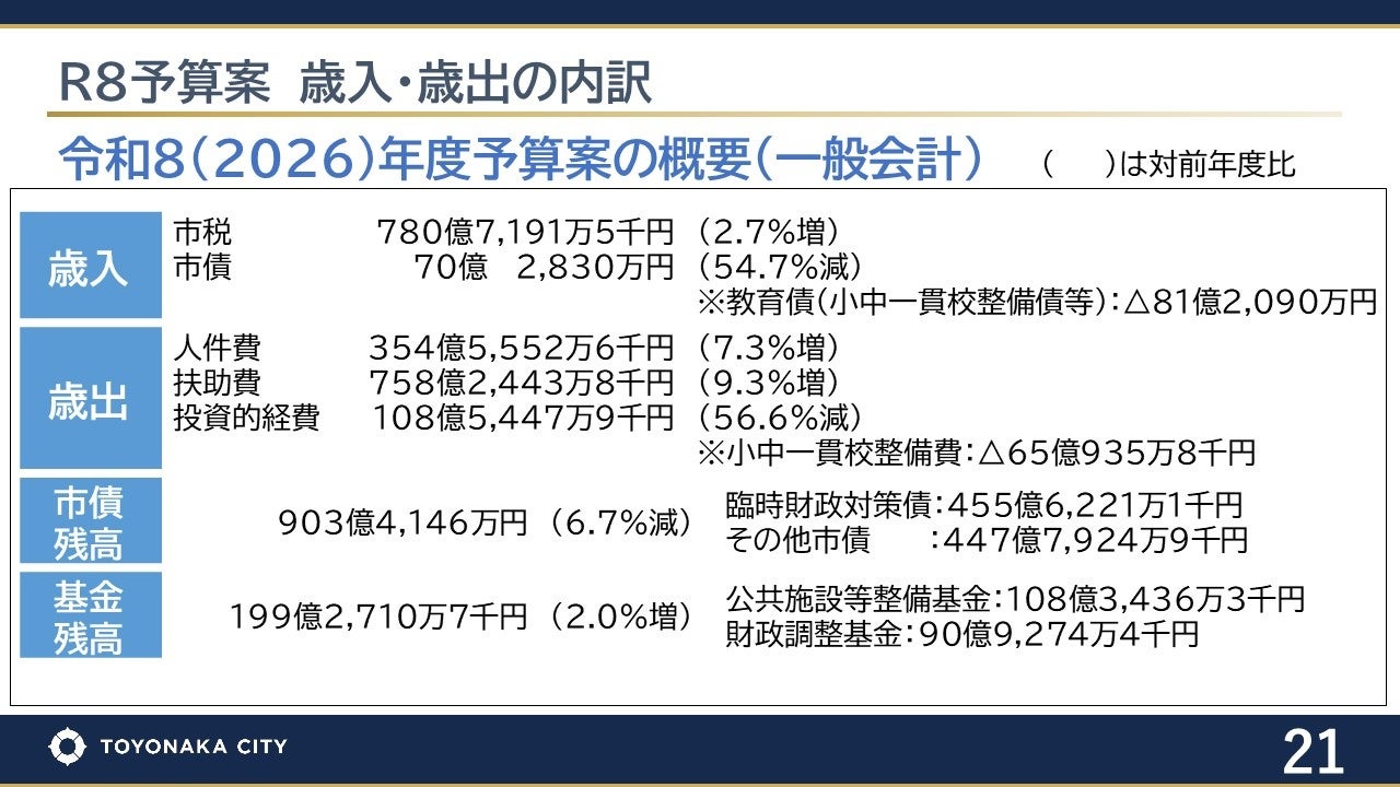 豊中市における令和8年度(2026年度)予算案をまとめましたので発表します。