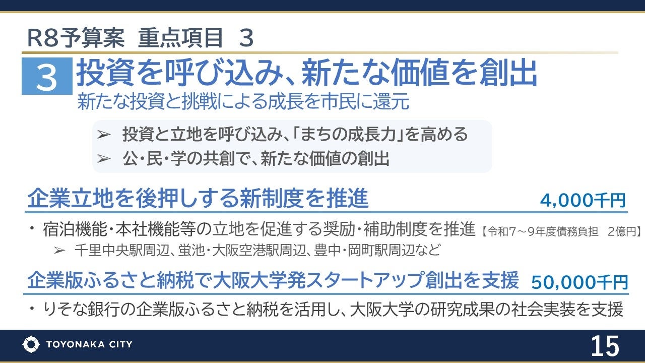 予算案 重点項目3「投資を呼び込み、新たな価値を創出」