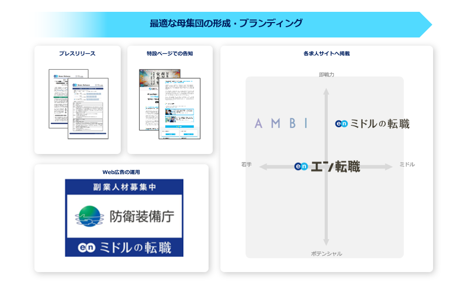 プレスリリースや特設ページ、Web広告での告知に加え、各求人サイトでの集客支援を実施。『エン転職』『AMBI』『ミドルの転職』とターゲットの異なる求人サイトを活用することで、ターゲットへ網羅的に求人を届けました。