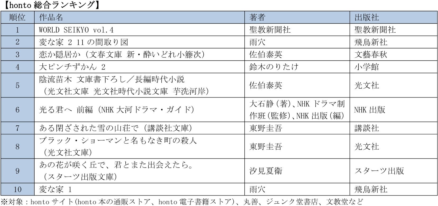 hontoランキングは、honto サイトと、honto サービス実施店の丸善、ジュンク堂書店、文教堂などで購入された書籍や電子書籍の販売データをもとに集計しています。