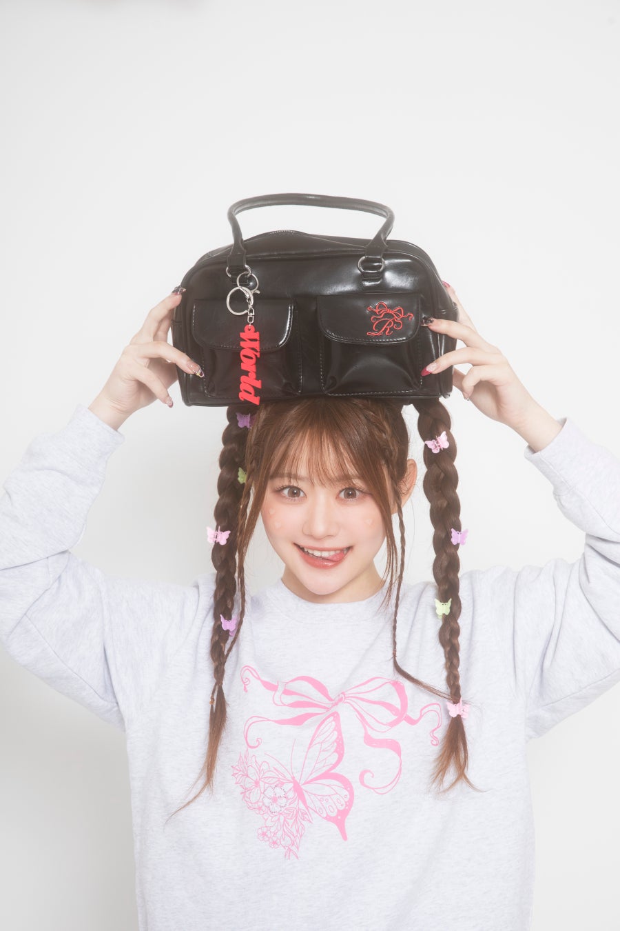 ファンならおなじみの彼女のセリフをデザインに落とし込んだキーホルダー付き、2ポケットPUハンドバック。