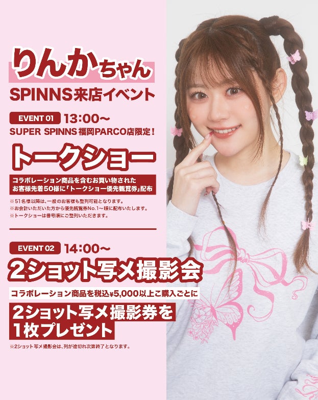 若者向けアパレル事業を中心に展開する、株式会社ヒューマンフォーラム(本社:京都市中京区 代表取締役会長:出路雅明)が運営する「SPINNS(スピンズ)」が今次世代のご意見番として大人気のインフルエンサー・クリエイターの「りんか」とのコラボレーションアイテムを販売します。さらに、イベントの開催も決定しました。