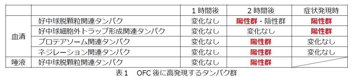 血清および唾液からは、それぞれ4,138個および7,202個のタンパクが同定されました。OFC 2時間後の血清サンプルにおいては、プロテアソーム(注5)やネジレーション(注6)関連タンパクの増加が、陽性群のみで認められました。一方、症状発現時には、陽性群において好中球脱顆粒などの好中球活性化や好中球細胞外トラップ形成(注7)に関連するタンパクが認められました。また唾液においては、陽性群にOFC2時間後に好中球脱顆粒関連タンパクの高発現を認めました(表1)。