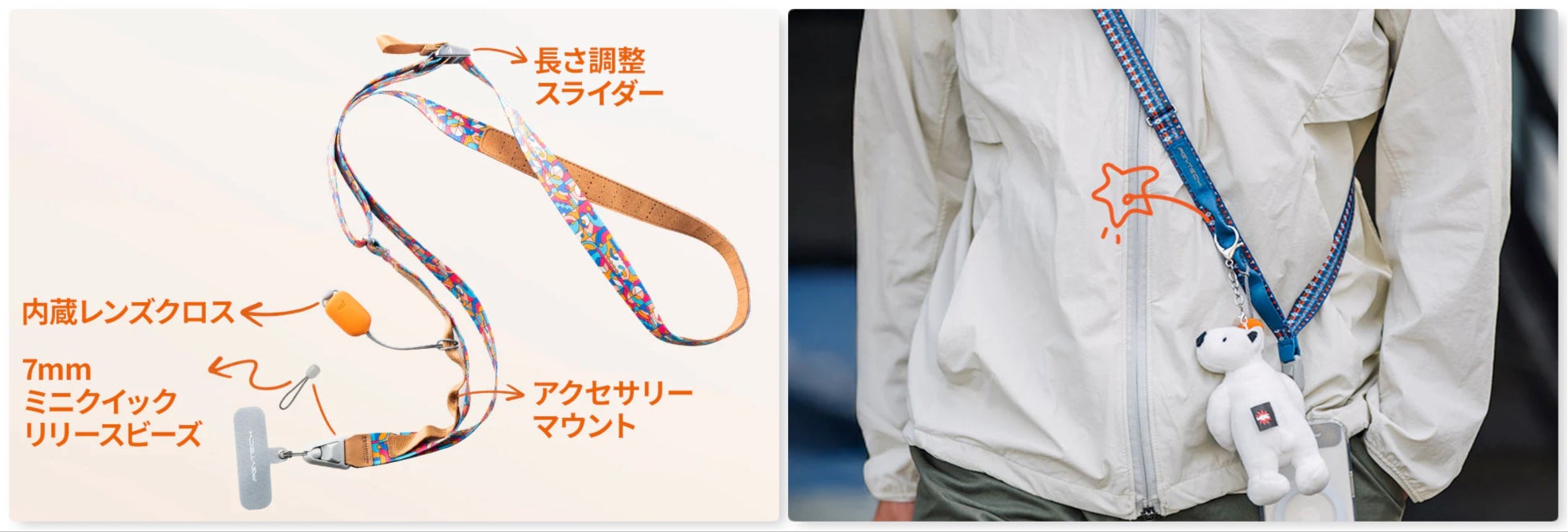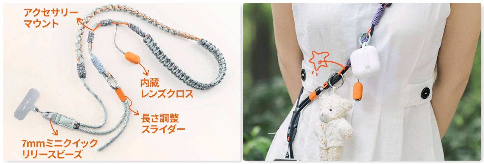 片手でスムーズに着脱できる独自設計のクイックコネクターを採用し、取り付けは簡単で、紐を引くだけで簡単に長さを調整できます。すべてのモデルにレンズクロスが付属するので、スマートフォンのカメラを綺麗に保つことができます。キャンプや夏フェスなどのアウトドアシーンをおしゃれに、快適にサポートします。