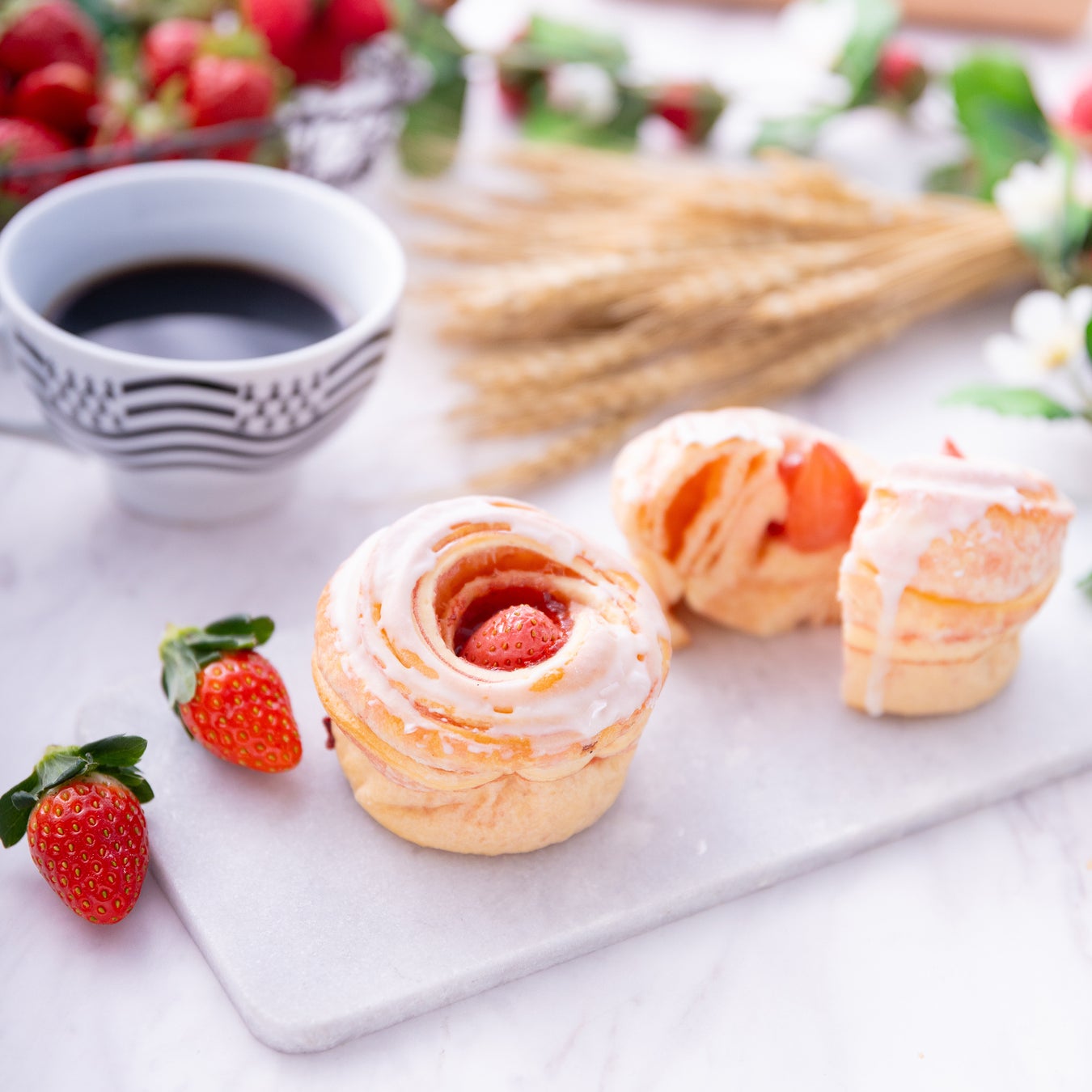 いちごのシートを巻き込んだロールパンにフレッシュのいちごをのせ、練乳入りのアイシングで仕上げました。