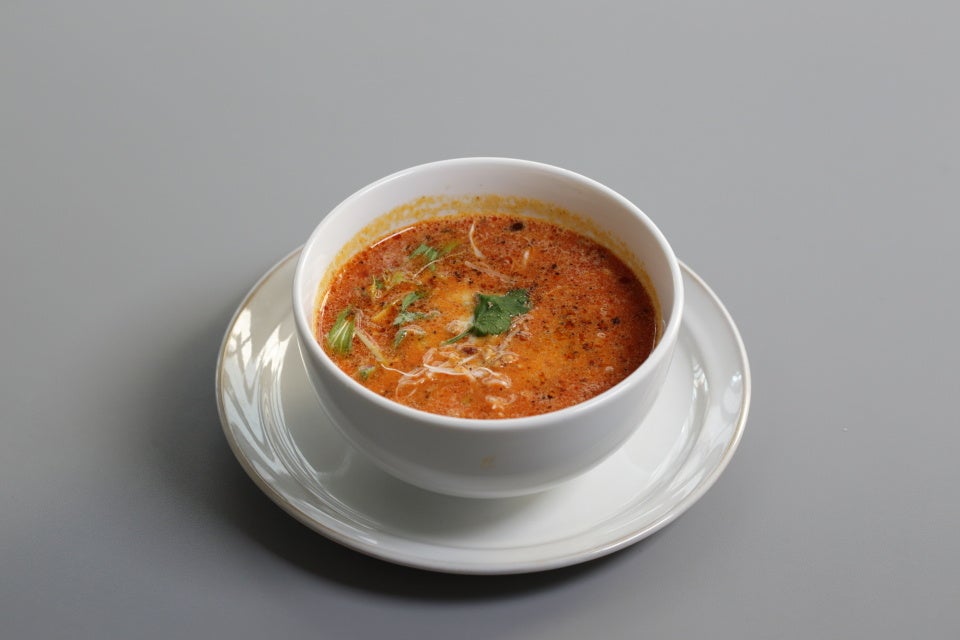 春雨を入れた挽き肉たっぷり担々スープ。薬膳スープをベースに自家製のラー油でピリ辛に仕上げました。挽き肉にもしっかり味が付いているので、お酒が進みます。