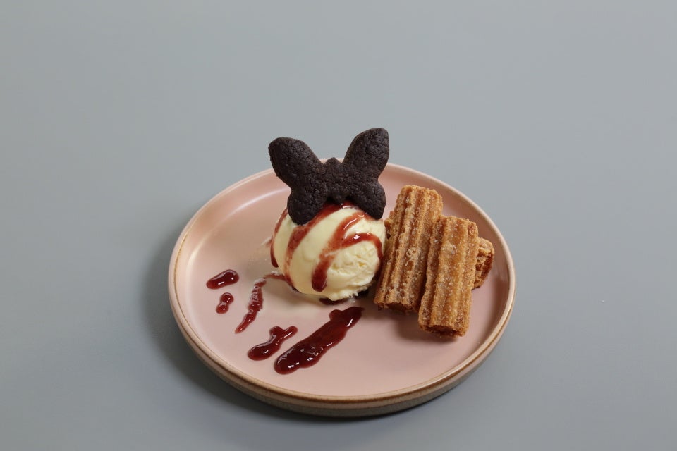 揚げたてのミニチュロスにお砂糖をまぶし、バニラアイスにはイチジクのソースで赤い演出を。ココア味の特製パピヨンクッキー付き。