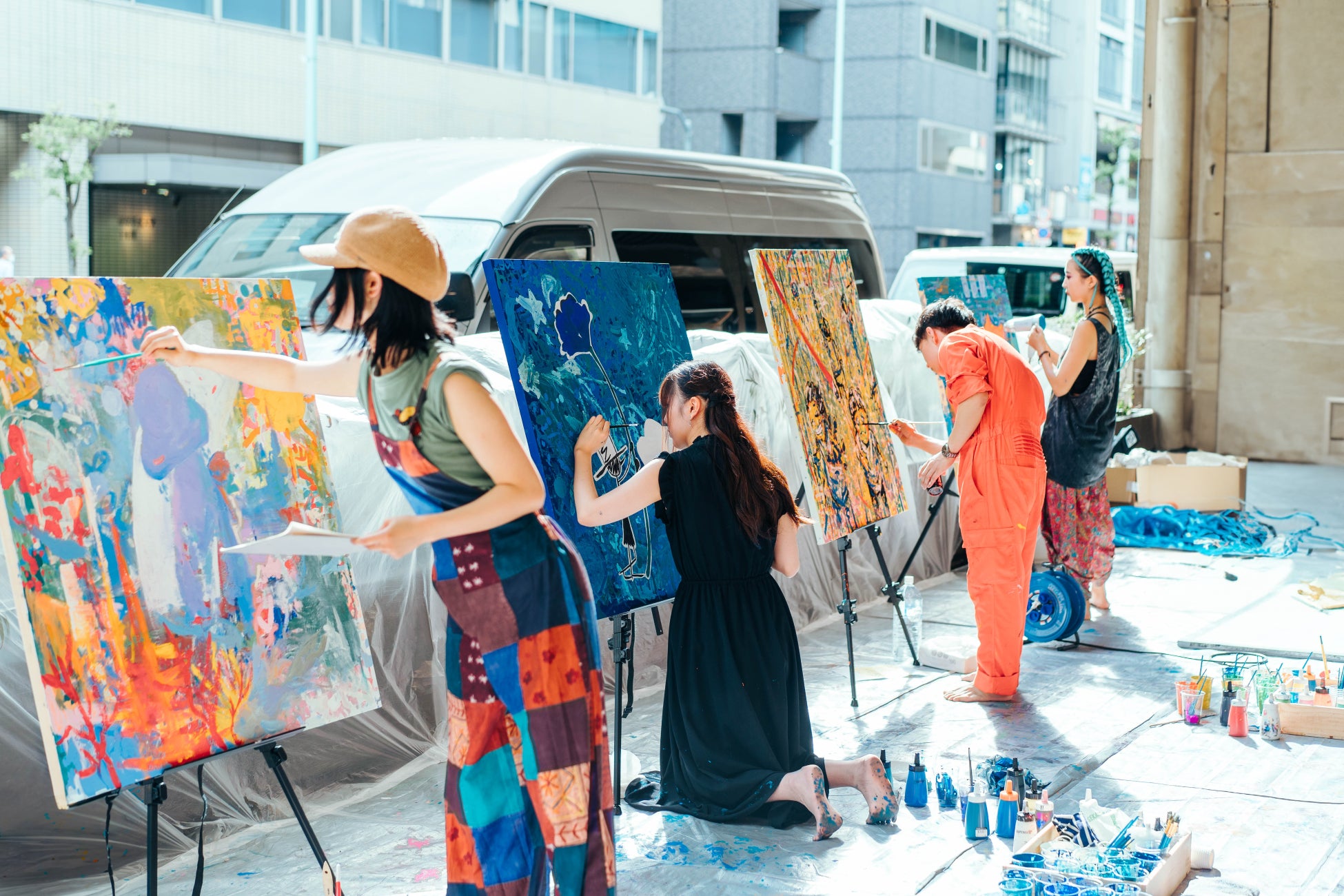 子どもたちが自由な発想で描いたキャンバスに、個性豊かなアーティストたちがその場で手を加えて1枚のアート作品に仕上げます