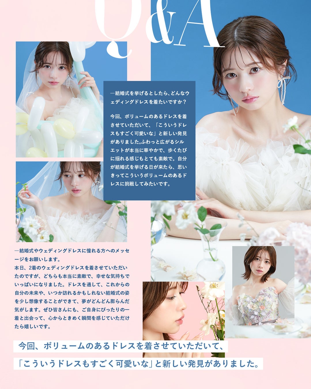 本日、2着のウェディングドレスを着させていただいたのですが、どちらも本当に素敵で、幸せな気持ちでいっぱいになりました。ドレスを通して、これからの自分の未来や、いつか訪れるかもしれない結婚式の姿を少し想像することができて、夢がどんどん膨らんだ気がします。ぜひ皆さんにも、ご自身にぴったりの一着と出会って、心からときめく瞬間を感じていただけたら嬉しいです。(インタビューより抜粋)