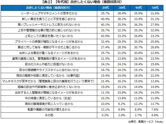 また、20代から50代のいずれの年代にも突出して多い理由は見られませんでしたが、20代の「上司としての責任を負いたくないから」(42.9%)は、他年代より高い傾向にあることが分かりました。【表②】