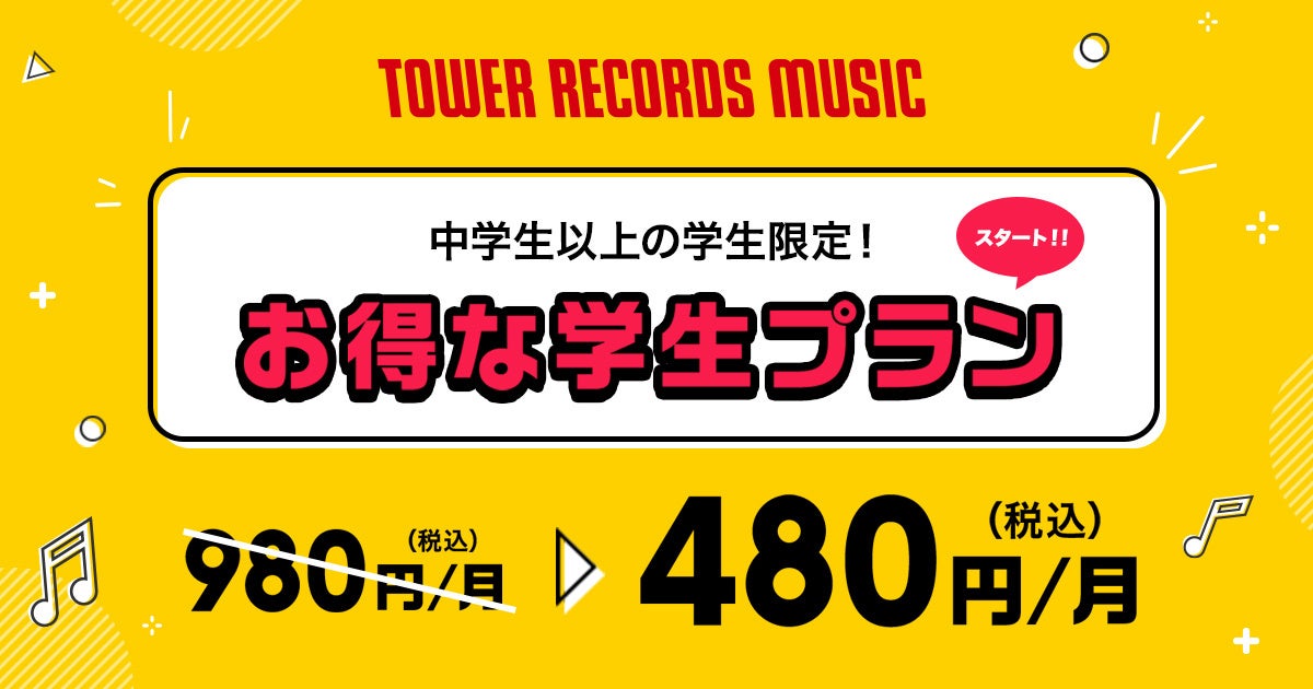 「TOWER RECORDS MUSIC」では1周年を記念して中学生以上の学生限定で学生プランのお申込受付を開始しています。今なら、学生プランのサービス利用開始で、TOWER RECORDS ONLINEで使える500円クーポンを最大6か月間プレゼント。詳しくは、こちら(https://music.tower.jp/)のページをご確認ください。