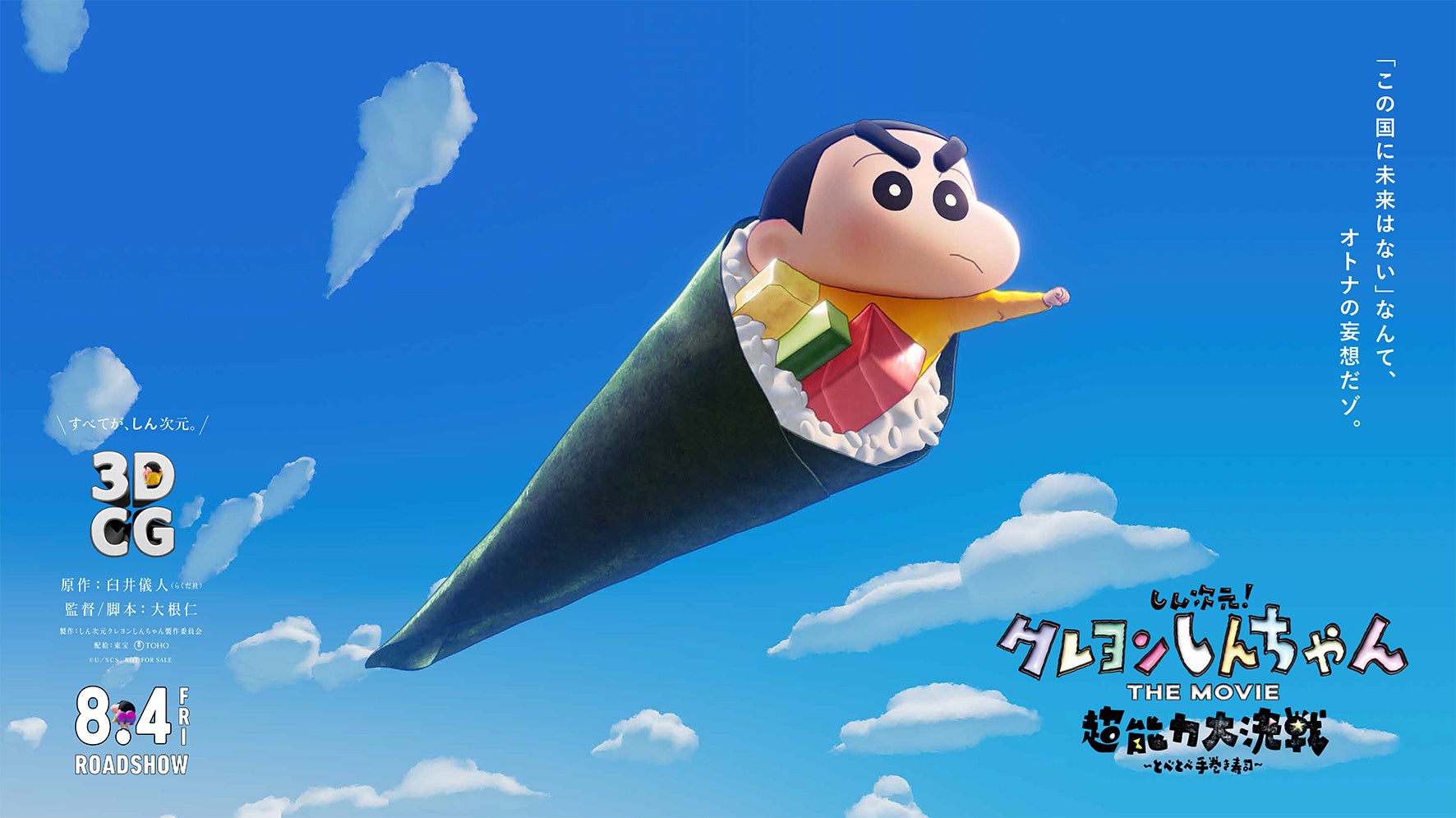 「クレヨンしんちゃん」史上初となる全編3DCGアニメーション化する映画『しん次元!クレヨンしんちゃんTHE MOVIE 超能力大決戦 ~とべとべ手巻き寿司~』の公開日が2023年8月4日(金)に決定。