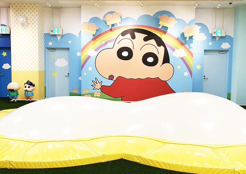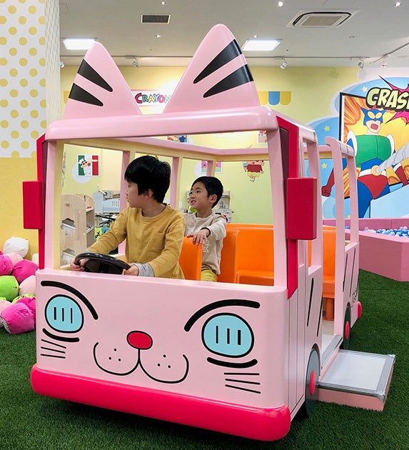 施設内にはふたば幼稚園の通園バス、園服を着たしんちゃん、壁にはたくさんのキャラクターと写真スポットも盛りだくさん。