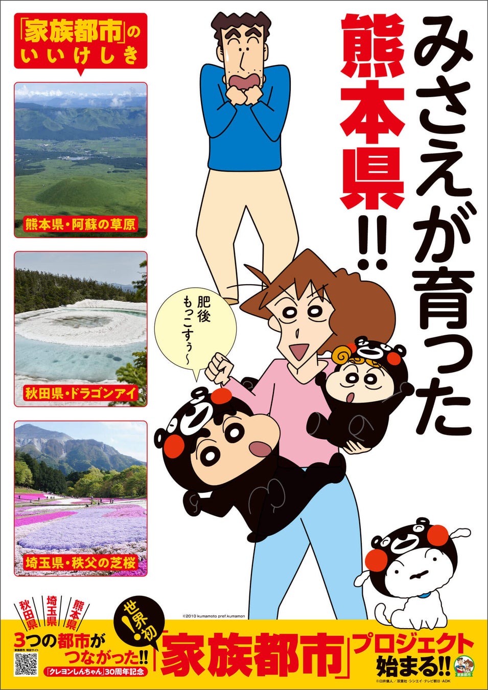 また「クレヨンしんちゃん」と、秋田県(父・ひろしの出身地)・埼玉県(野原一家が暮らす場所)・熊本県(母・みさえの出身地)が、2022年7月から「家族都市プロジェクト」を開始、しんちゃんたち野原一家が『家族』として力を合わせ、三県の観光振興と地域活性化及び相互交流施策に取り組んでいます。