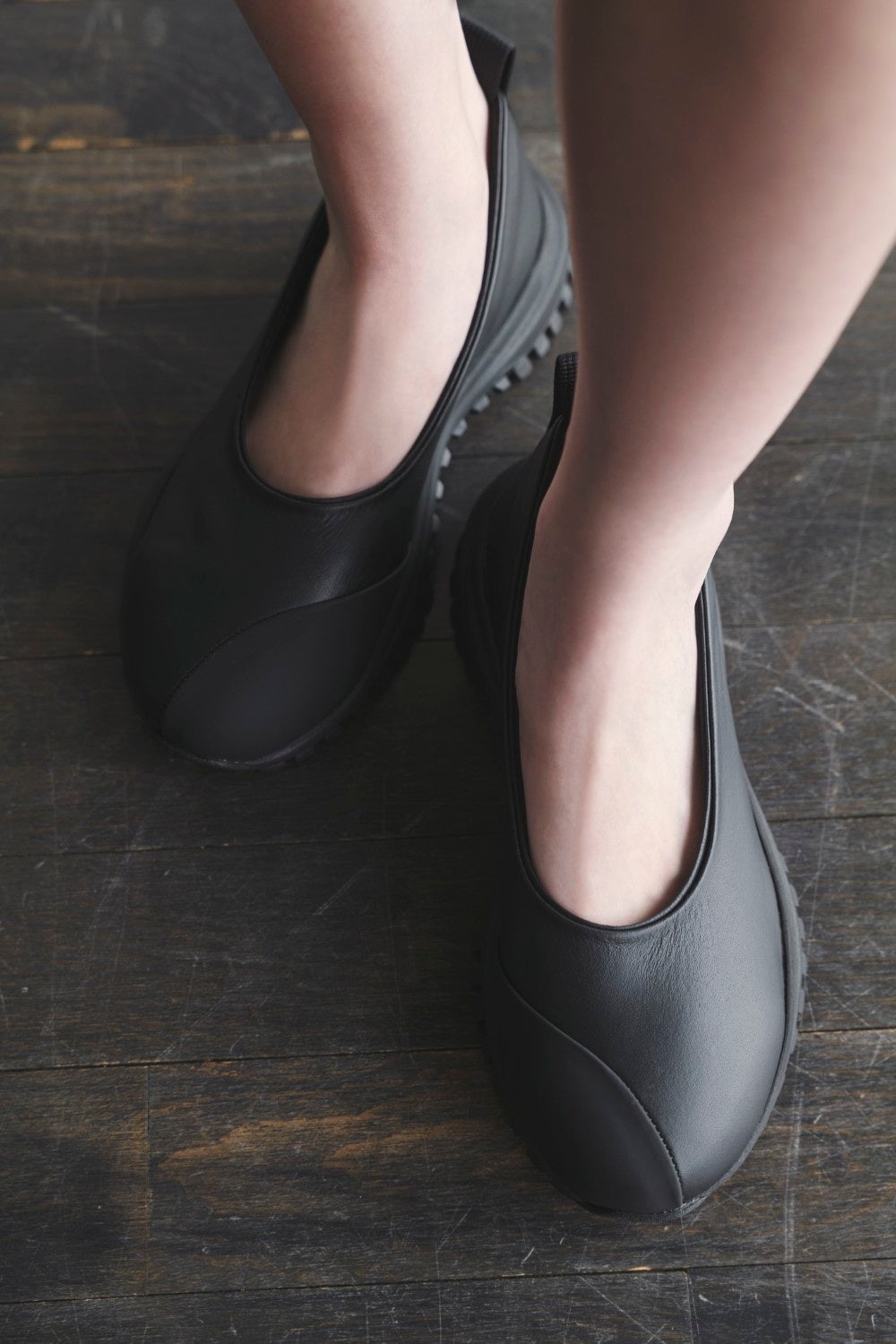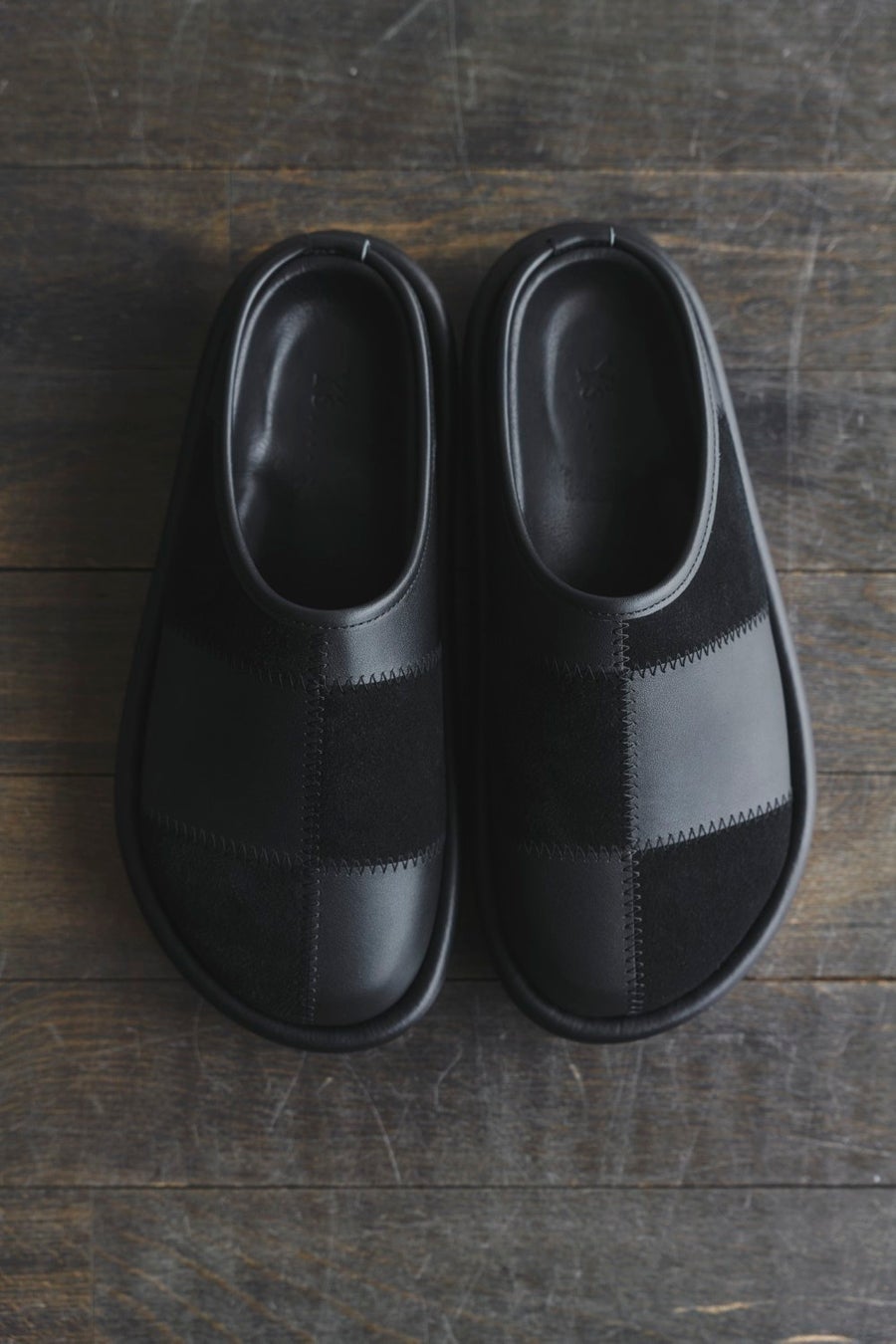 Y's....のサンダルシューズ。2026年春夏では、異素材を組み合わせたパッチワークのデザイン。