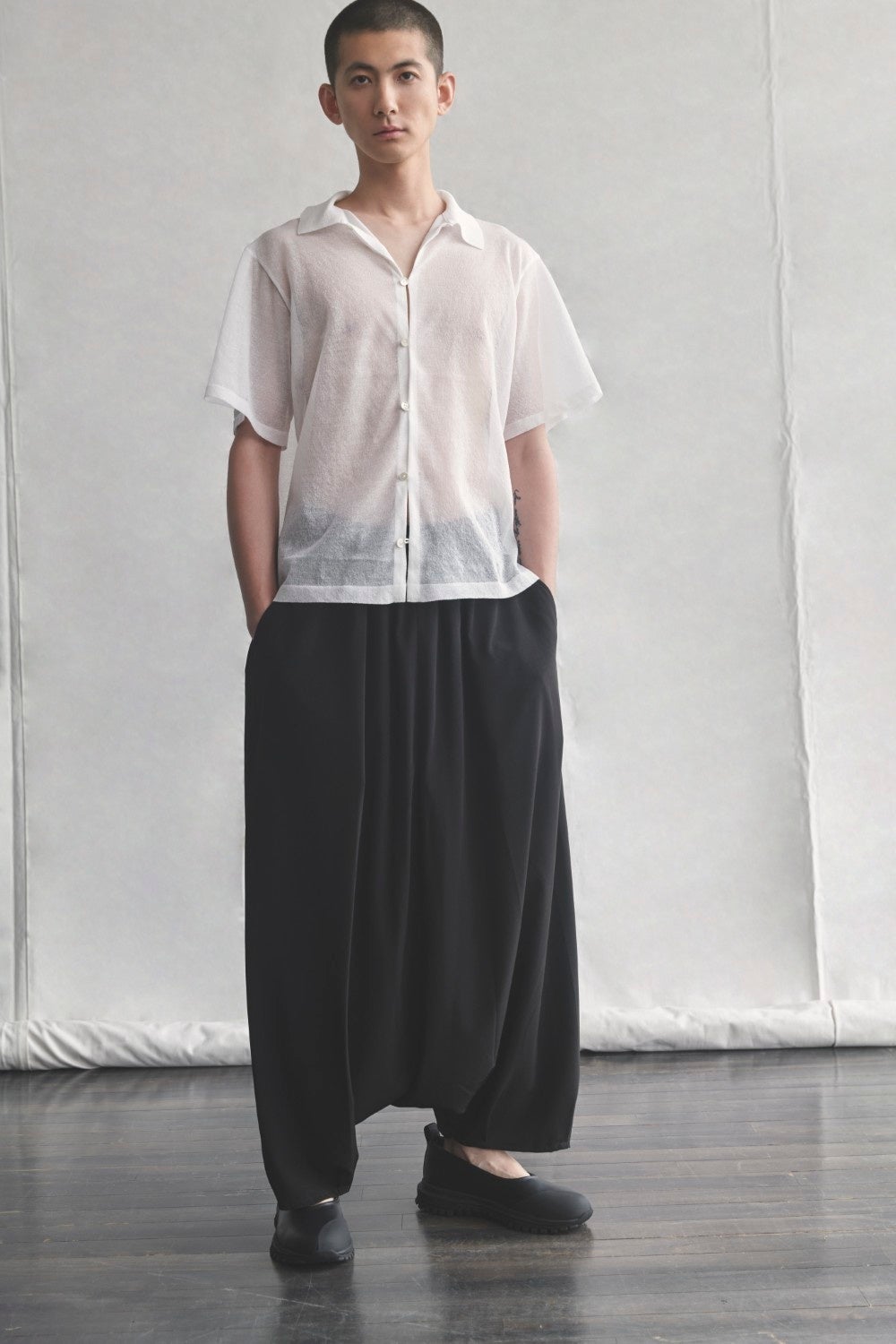 分量感のあるサルエルパンツ。