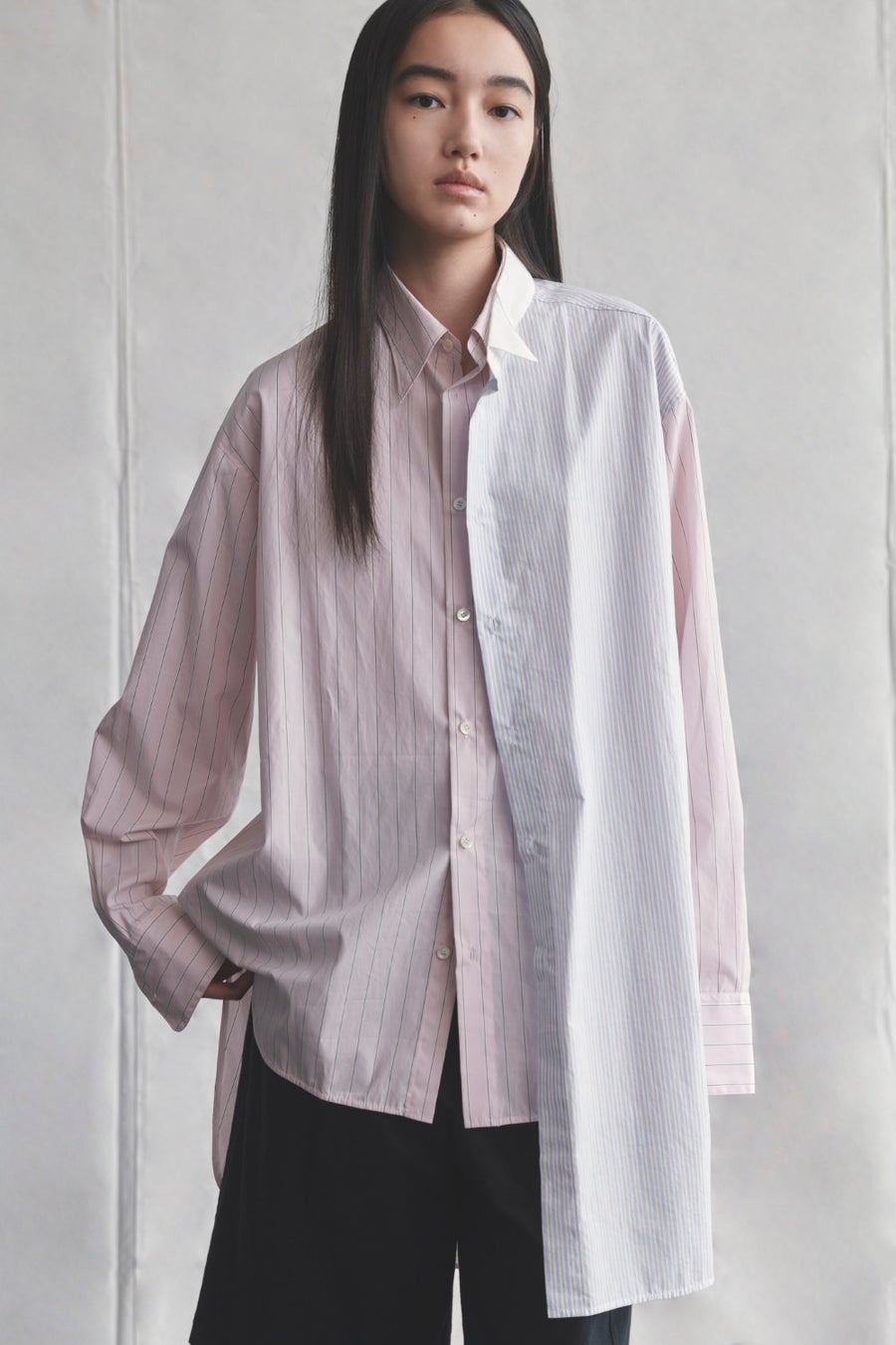 異なるストライプ生地を重ねたアシンメトリーシャツ。カジュアルな中に、さりげないエレガンスを添える。