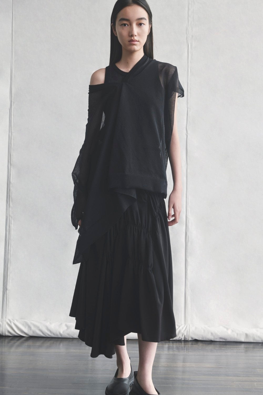 ユニークなフォルムを描く変形のカーディガン。ギャザースカートに合わせ、Y's....らしいスタイルを完成させる。