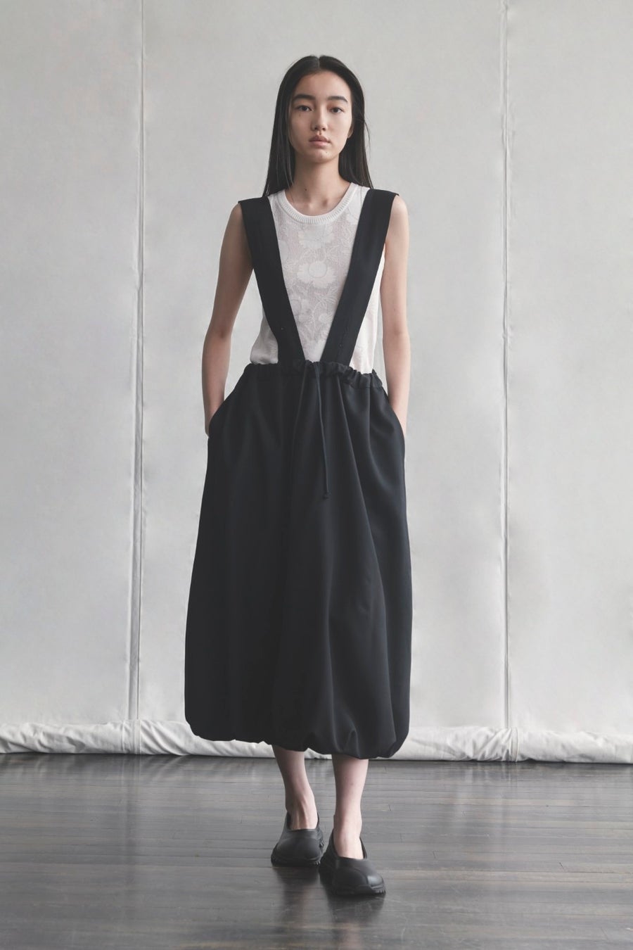 バルーンのようなフォルムを描いたスカート。スタイリッシュなスニーカー。