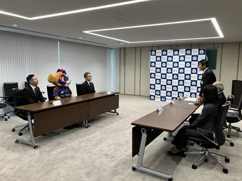 府中市役所では、今年から新たに寄贈ということで贈呈式が開催され、府中市から高野市長、古森・田中副市長、FC東京から川岸社長とチームマスコットの東京ドロンパが出席をいたしました。